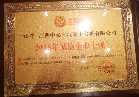 我司江西中泰來混凝土管樁有限公司榮獲“土筑虎杯”2018年誠信企業(yè)十強(qiáng)單位,九江中泰來新型建材有限公司榮獲“土筑虎”杯2018年創(chuàng)新企業(yè)十強(qiáng)單位!