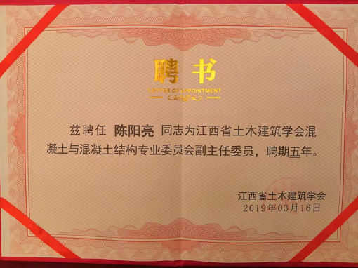 本次會議還對本屆主任委員、副主任委員頒發(fā)了聘書,聘期為五年,我司總經(jīng)理陳陽亮先生也被聘為江西省土木建筑學(xué)會混凝土與混凝土結(jié)構(gòu)專業(yè)委員副主任委員之一。
