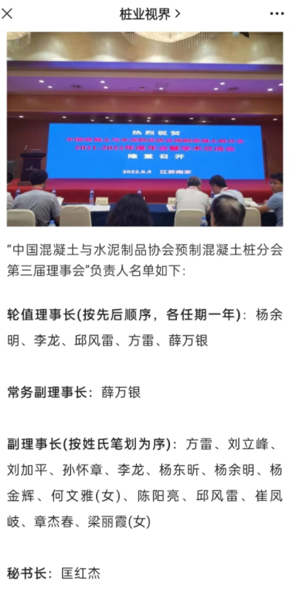 2022年8月5日,中國混凝土與水泥制品協(xié)會預制混凝土樁分會2021-2022年度年會暨學術交流會在江蘇南京隆重召開,會上公布了”中國混凝土與水泥制品協(xié)會預制混凝土樁分會第三屆理事會“負責人名單,我司總經理陳陽亮先生擔任副理事長。